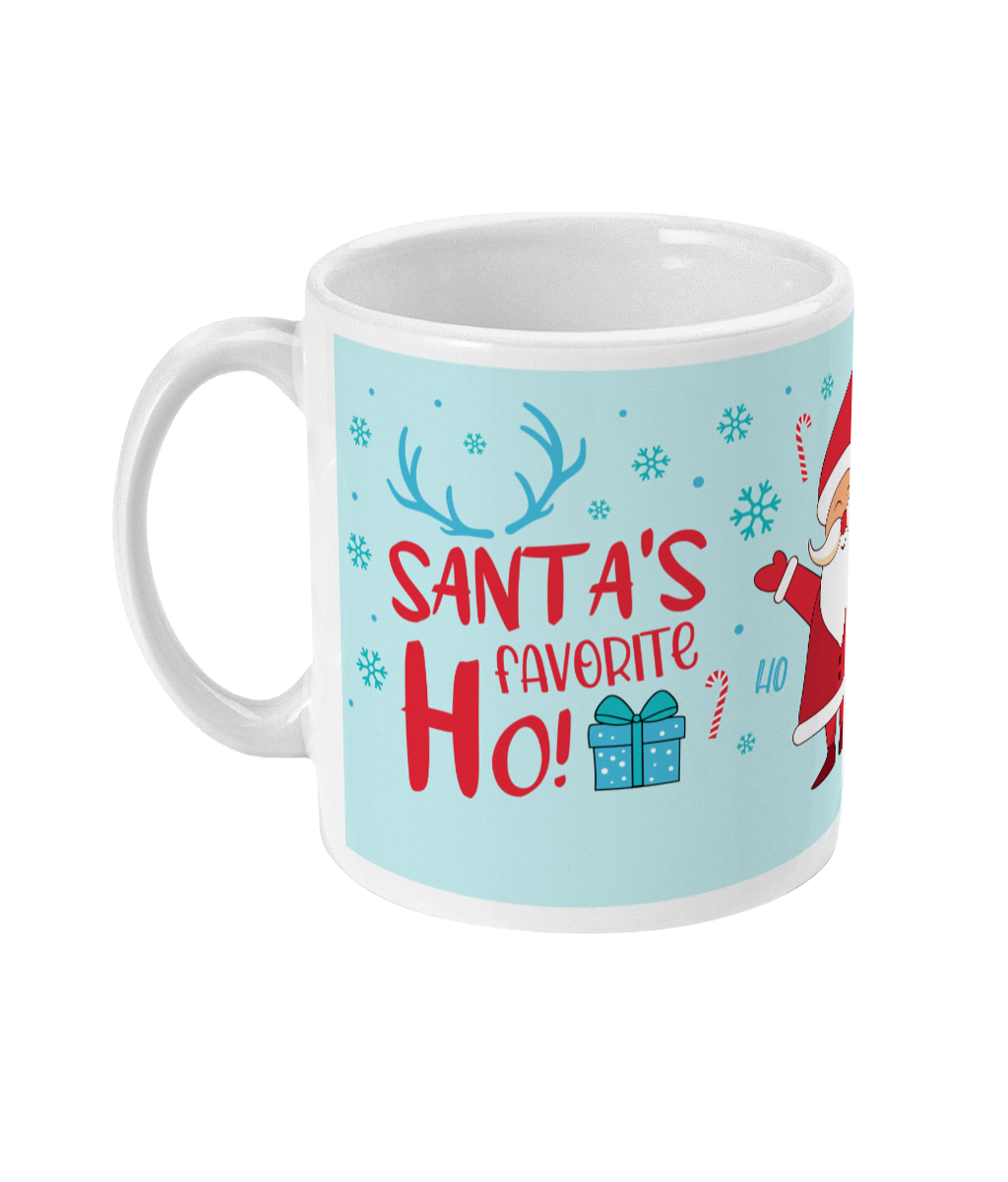 Alle elementen zijn in verschillende tinten blauw geïllustreerd, wat de mok een winterse en stijlvolle uitstraling geeft. Onder de Kerstman staat de tekst: "Santa's favorite ho", wat zorgt voor een grappige, feestelijke twist.