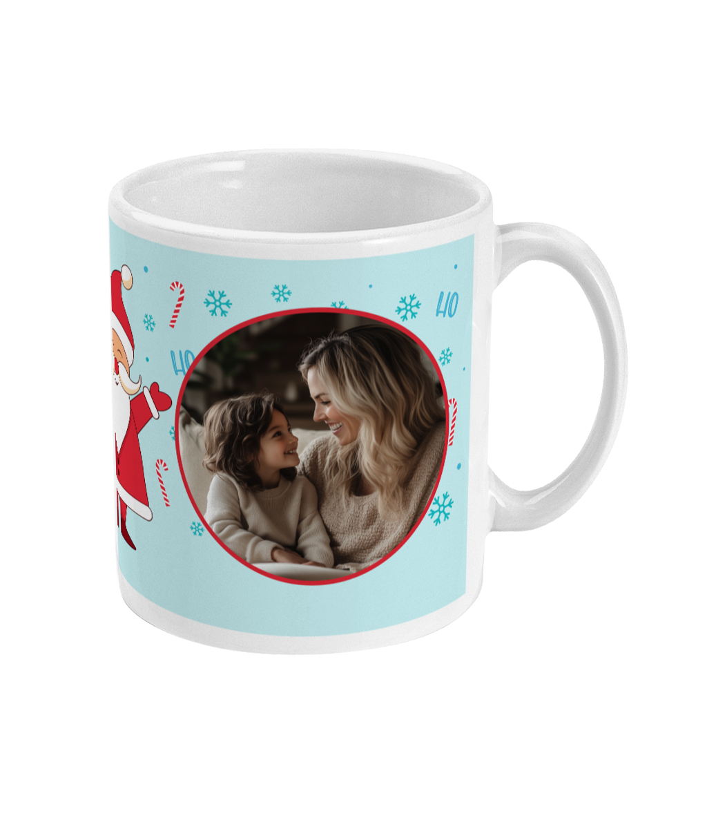 Vrolijke gepersonaliseerde kerst mok met kerstman in blauwtinten en ronde foto op mok