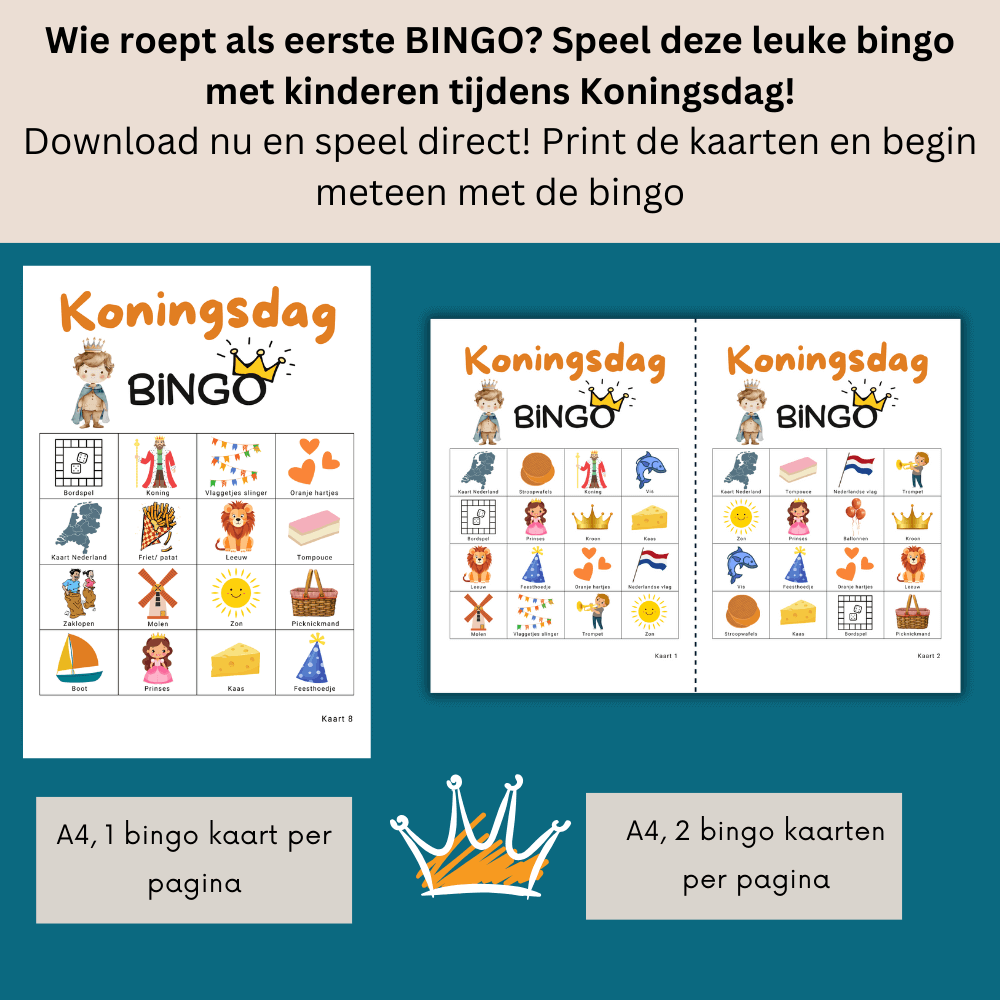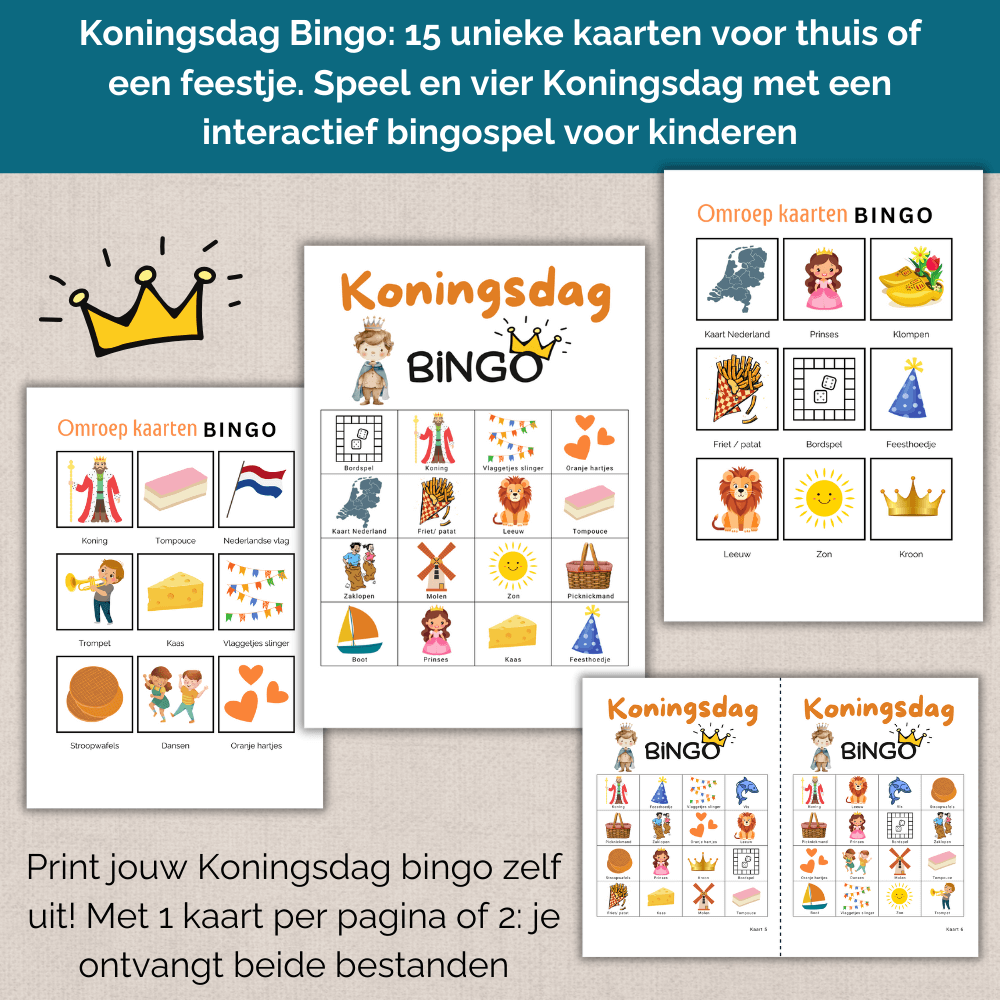 Kinder bingo koningsdag: een speels en leerzaam spel voor kinderen (15 kaarten)
