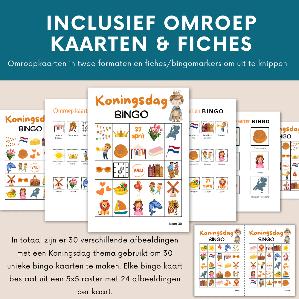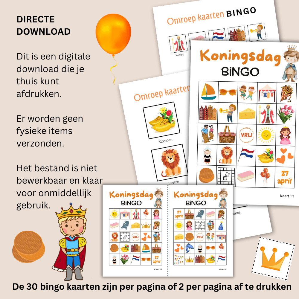 Wil je een Koningsdag activiteit die direct klaar is voor gebruik? Koningsdag Bingo is direct te downloaden, zonder voorbereiding. Na aankoop ontvang je een PDF met 30 unieke Koningsdag bingo kaarten, plus een aparte PDF met omroepkaarten, speluitleg en fiches. Je print de bingo kaarten eenvoudig en kunt direct beginnen met spelen.