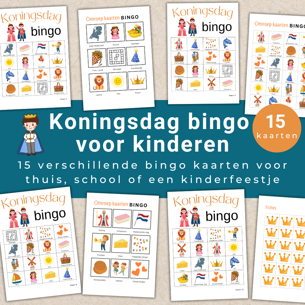 Met 15 unieke bingo kaarten vol herkenbare Koningsdag afbeeldingen, zoals de koning, klompen, een Nederlandse vlag en oranje versiering, is dit een perfect spel voor kinderen. Voor jonge kinderen zijn de plaatjes herkenbaar, voor de wat oudere kinderen die al kunnen lezen staan de woorden onder het plaatje. Download de PDF, print de Koningsdagbingo kaarten en speel direct mee!