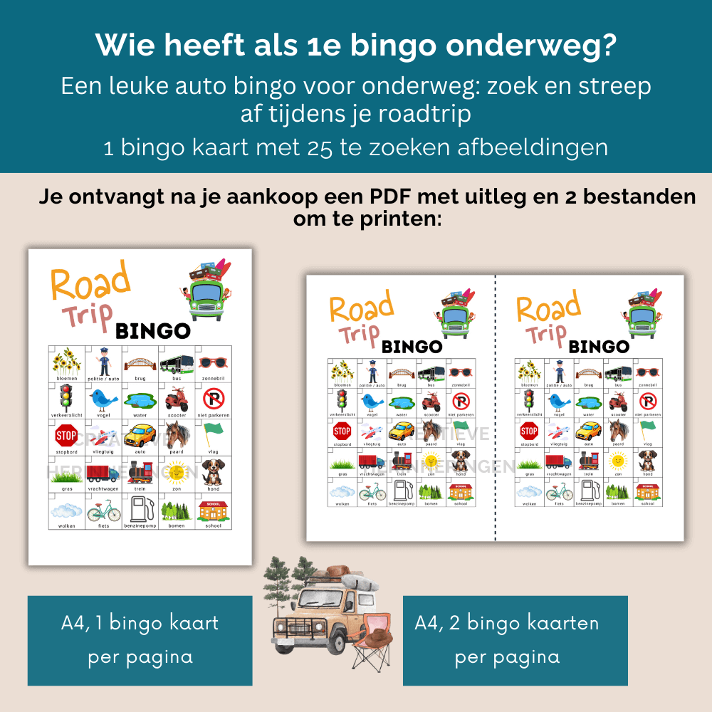 Perfect als auto spelletjes tijdens vakanties, roadtrips of een spontaan dagje uit. Pak een pen, potlood of stift, geef iedereen een bingokaart en laat de zoektocht beginnen.
