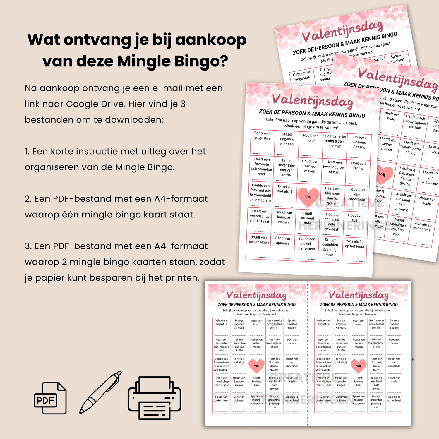- Eenvoudig te organiseren: na aankoop ontvang je een digitale download (PDF) met 3 bestanden: